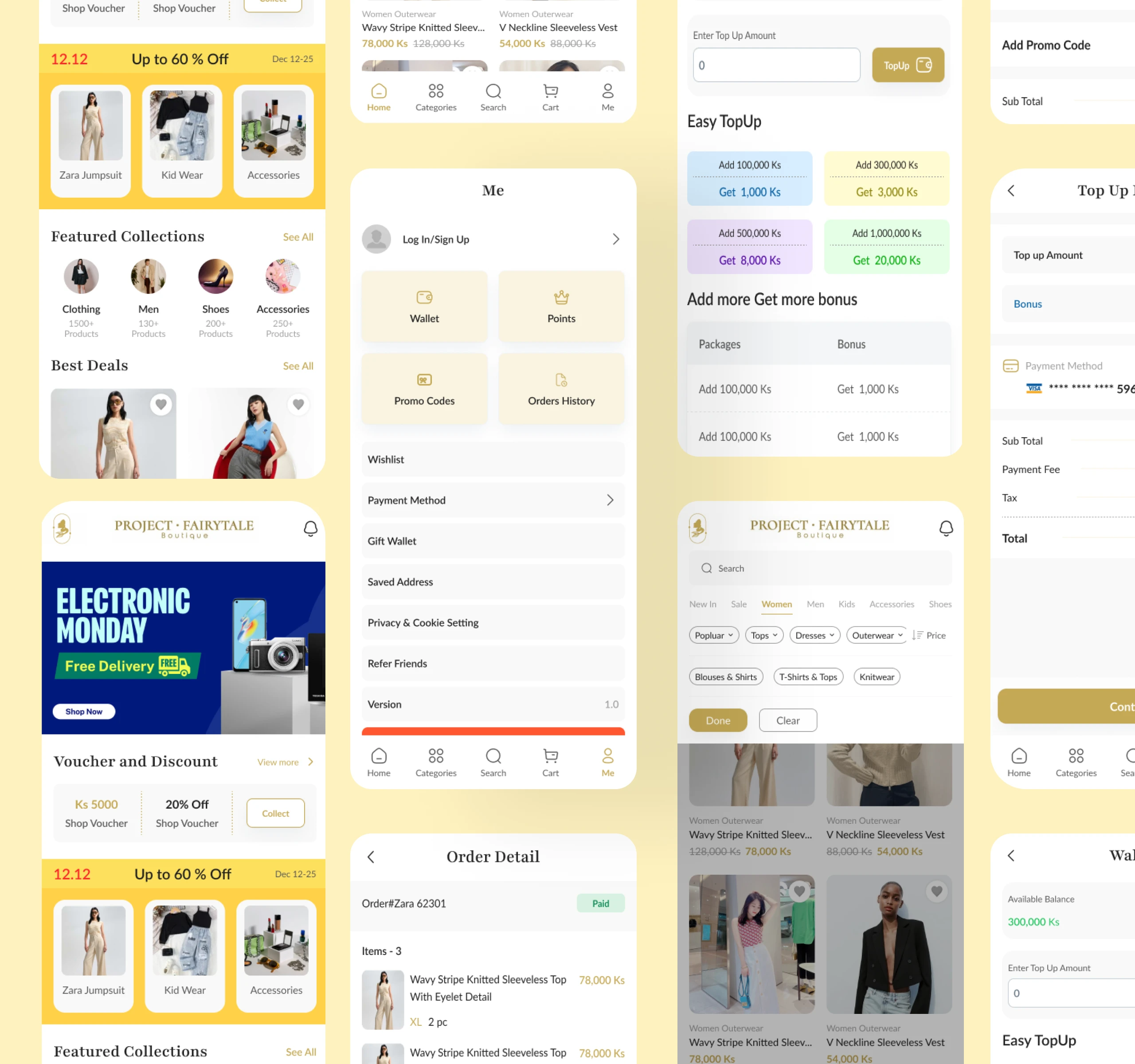 Project Fairytale, a vibrant eCommerce app specializing in branded clothing, needed a platform that reflected its stylish, modern identity while delivering a smooth shopping experience. The challenge was to design a clean, user-friendly interface that balanced eye-catching visuals with ease of use and performance.